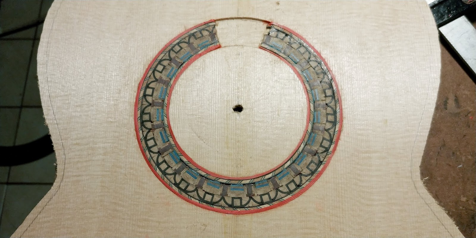 Following that I added a tinge of red purfling to the rosette to make it more compatible with the back wood.